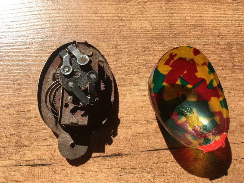 Es handelt sich hier um ein Spielzeug mit Lichteffekten. Oben seht ihr die vier "Arme", an denen sich Kohlebürsten befinden. Diese liegen auf einer Art Sandpapier auf, welches auf einer Drehscheibe befestigt ist. Wenn die Mechanik in Gang gesetzt wird, dann entstehen durch die Reibung Funken. Durch den transparenten Panzer kann man diese sprühen sehen.