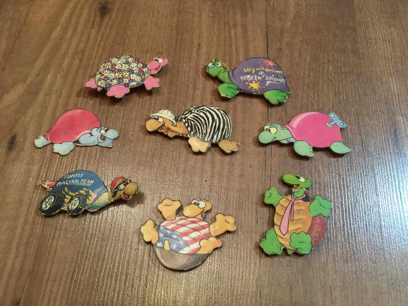 Ihre Sammelleidenschaft für Schildkröten begann mit den lustigen, bunten Pappmagneten, welche wir immer am Küchentürrahmen hängen hatten. Das muss so ca. 1980 gewesen sein.”