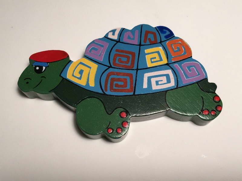 Das hier sind Mannis "Holzschildkröten". Besonders schön finde ich (natürlich neben Manni & Eva) den Untersetzer, die Schildi mit der bunten Kugel und die Schildkröte in Schwarz-Weiß.