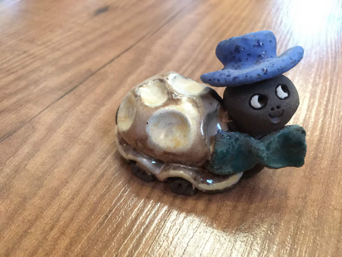 Die meisten dieser Schildis wurden aus Keramik gefertigt. Zum Beispiel die eine mit Fliege und Hut und die dunkle Schildkröte, die täuschend echt aussieht.